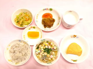 | ・曙粥(人参) ・すまし汁(豆腐・人参・キャベツ) ・ささみの煮物(ささみ・玉葱) ・トマトの煮物(トマト) |